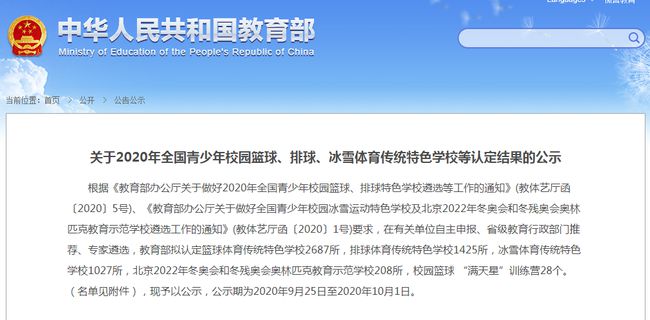 根据《教育部办公厅关于做好2020年全国青少年校园篮球、排球特色学校遴选等工作的通知》、《教育部办公厅关于做好全国青少年校园冰雪运动特色学校及北京2022年冬奥会和冬残奥会奥林匹克教育示范学校遴选工作的通知》要求,在有关单位自主申报、省级教育行政部门推荐、专家遴选,教育部拟认定篮球体育传统特色学校2687所,排球体育传统特色学校1425所,冰雪体育传统特色学校1027所,北京2022年冬奥会和冬残奥会奥林匹克教育示范学校208所,校园篮球 “满天星”训练营28个。