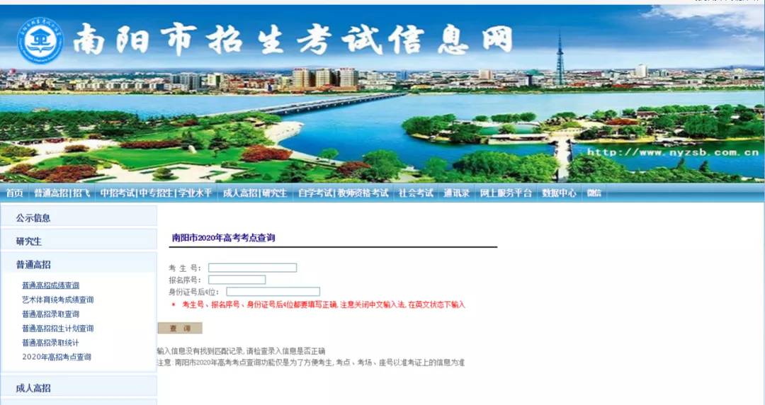 即日起,2020年南阳高考考生考点查询通道在南阳市招生考试信息网开通,考生可凭借考生号、报名序号和身份证号后四位等信息查询所在考点,