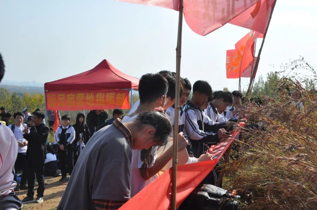 上午10:50所有师生成功到达了大本营。此时提前到达的志愿者队员已经为大家搭好了帐篷、做好了各项指示标牌。按照事先规划的场地,各班安营扎寨,原地休息,养精蓄锐,准备登顶。