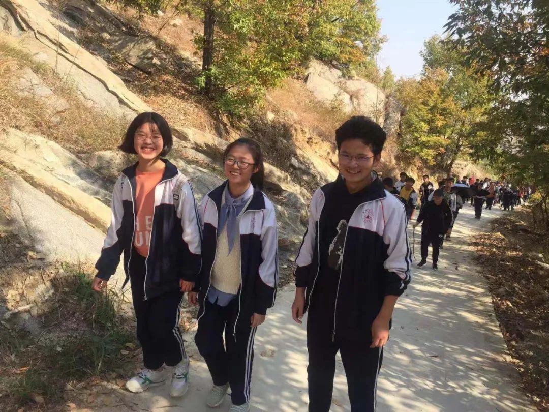 虽已深秋,骄阳依然烈如火,师生们砥砺志弥坚。磨山越来越近了,同学们打着班旗,唱着班歌,喊着口号,精神抖擞,伴着风景向前进发。