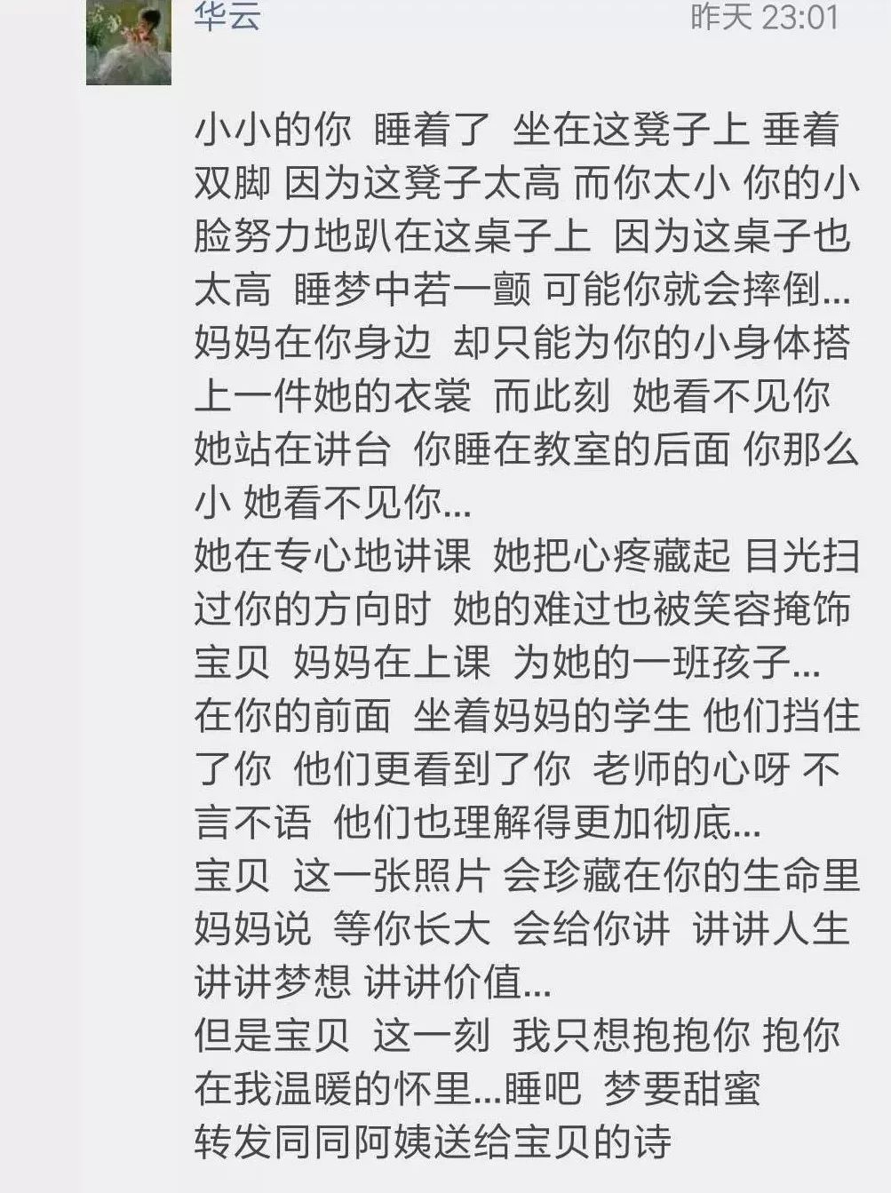 还有一名语文周老师发出这样的感慨:心酸,心痛。悲哀。除了短暂的假期,早晨从没能照料过孩子,因为我上班时,孩子还在睡梦中;逢到夜值班,孩子为了见到妈妈,跟着熬到夜里10点过;万一哪天忍不住睡着了,她第二天早晨还是见不到妈妈…而我,只能悄悄地给她一个吻…
