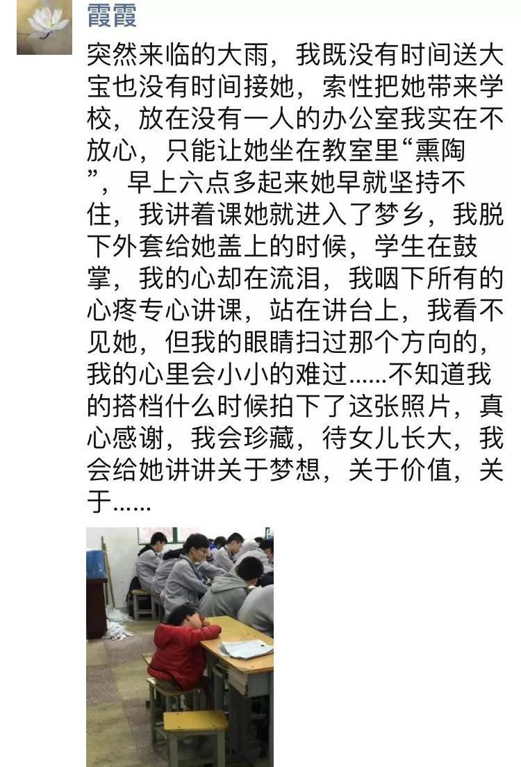 “可怜的孩子显然已经训练有素,在最活泼最坐不住的年龄,因为没有人照顾,静静地坐在教室后边课桌上默默地睡着啦。。。其实这不是个例!更不是仅有!全体老师们虽承负着社会生活的重压,依然凭着从来不曾泯灭的良知倾心奋斗在教学一线,难道、难道我们不应该为他们点赞吗?那些仍然在质疑老师们的责任心仍然在对老师吹毛求疵仍然在抱怨老师对学生不够关心爱护仍然为教师工资太高感觉失衡的所谓社会专家或心理不健全者们,看到这张照片,你,敢拍着胸脯对天说,你不汗颜吗?。。。孩子,原谅你的爸爸妈妈,因为选择所以无悔。。。长大了,你会懂。。。”