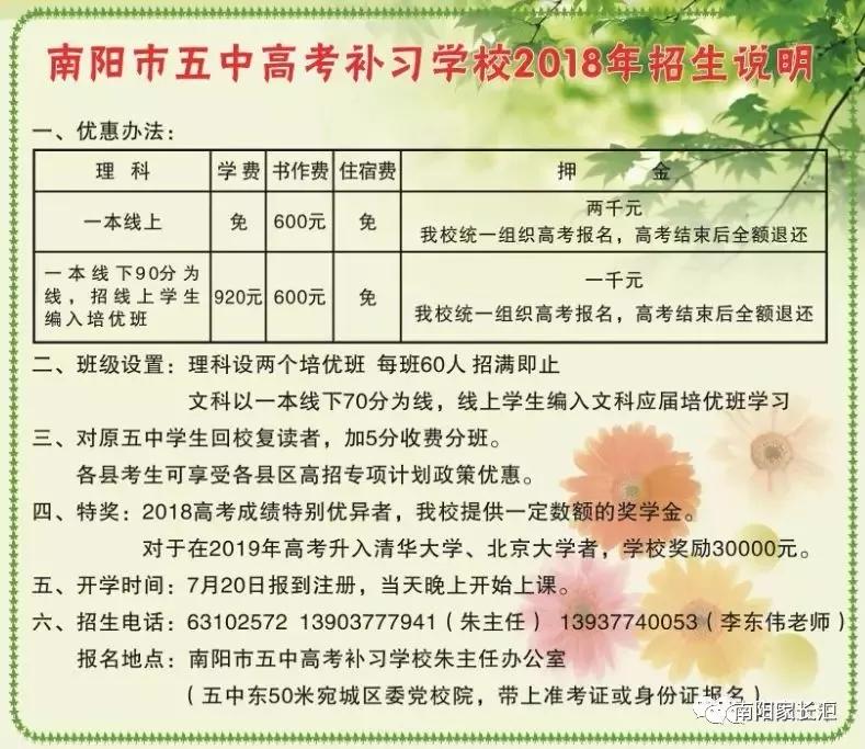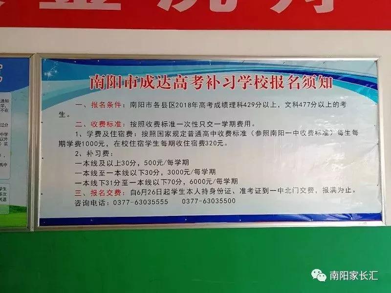 【招生计划】南阳市各县区理科429分以上,文科477分,,根据报名先后顺序,招满为止。2018年6月26日起,考生携带身份证、准考证、高考成绩单及有关费用到南阳市成达高考补习学校报名处报名,招满为止。7月20日开学。