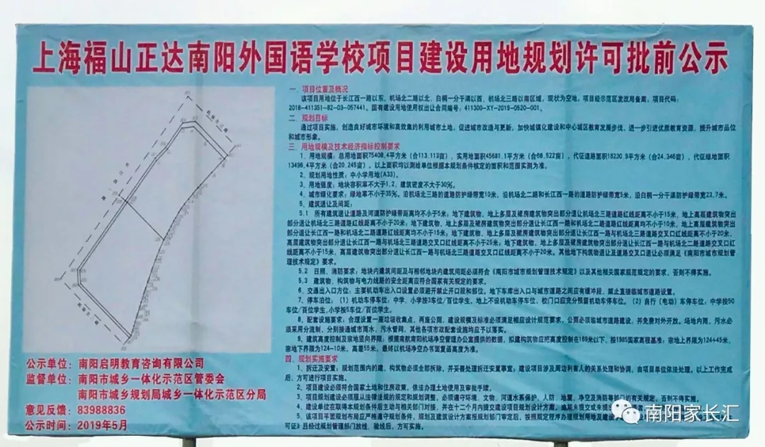 近日,位于南阳市光武桥东示范区规划展示馆附近的一块工地增加了一块展板,展板上标注着“上海福山正达南阳外国语学校项目建设用地规划许可批前公示”。在工地现场,已经陆续有施工车辆出入。