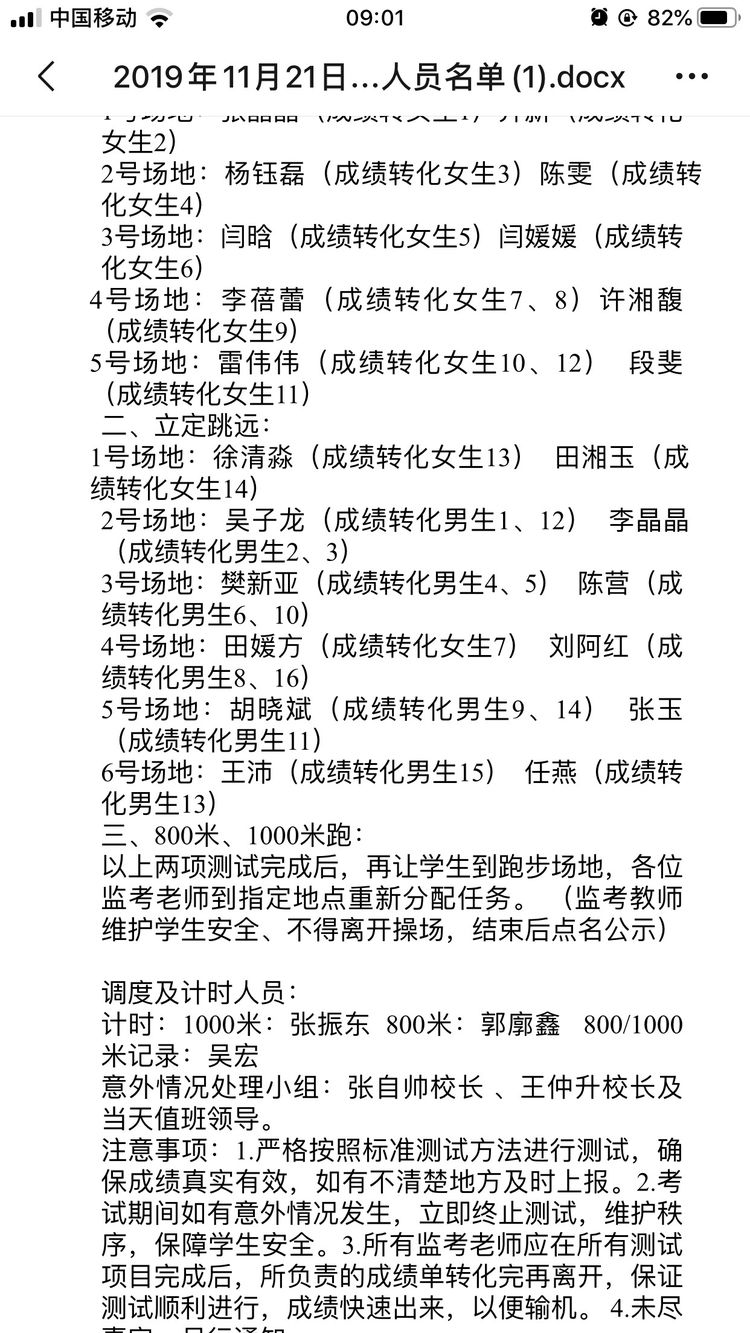 为检测九年级学生中考体育训练效果,使九年级学生更好地熟悉体育中考流程,引起学生对体育中考的重视,确保在中考体育考试中取得好成绩为下一阶段训练计划制订提供数据。我校于2019年11月21日在我校操场举行九年级体育模拟考试。