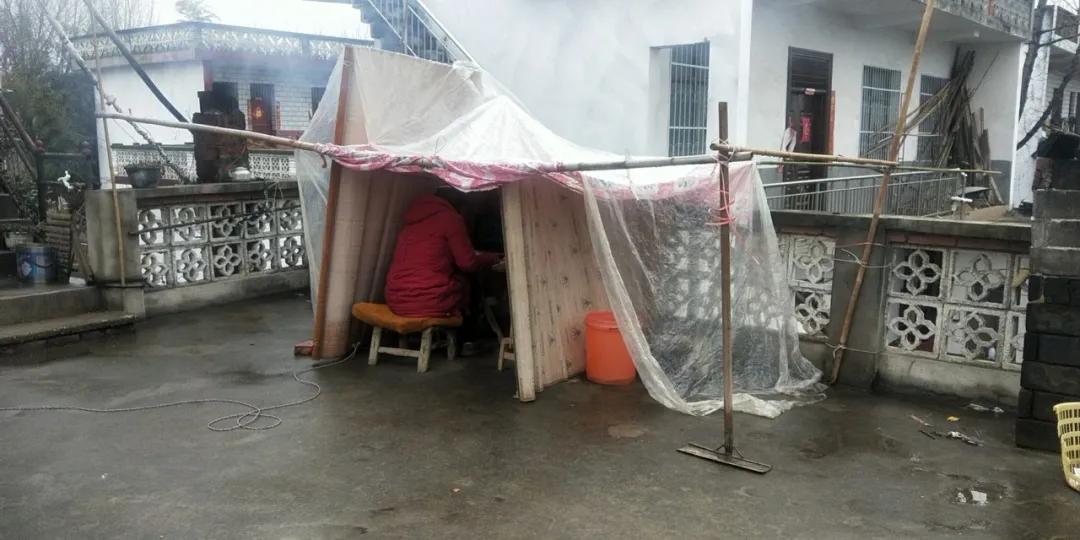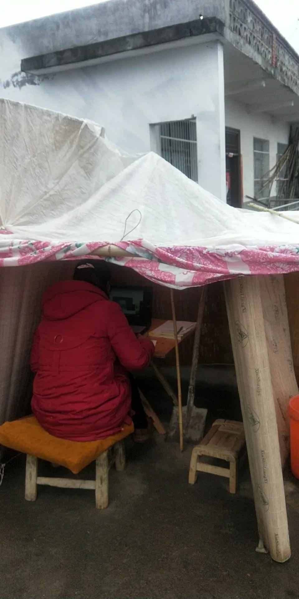 据苏文霞讲,为响应国家教育部“停课不停教、不停学”的号召、他们开始在老家准备上钉钉直播课,一开始他们用用手机上网给学生讲课,但因为老家没有网络,信号不稳定,效果并不好,内心非常着急。后来发现在楼顶上蹭邻居家的网比用流量好,还不用花钱。2月10日,他们用竹子、席子、塑料布等在自家屋顶搭建了一个简易“直播间”,开始轮流着给班级孩子们上课。