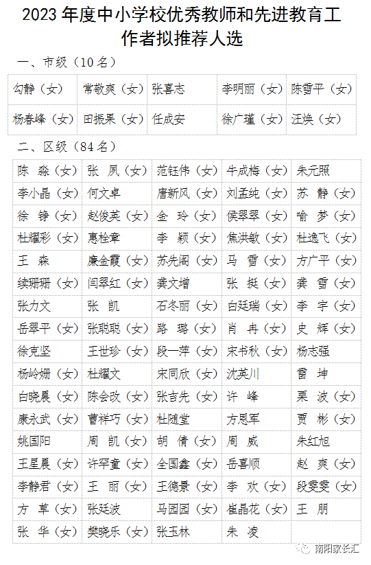 南阳市示范区2023年中小学校优秀教师和先进教育工作者拟推荐人选 示范区 未知/阳光 2023-09-07 次浏览 根据南阳市人力资源和社会保障局、南阳市教育局《关于做好2023年度全市中小学校优秀教师和先进教育工作者及时奖励的通知》(宛人社事业〔2023〕6号)和南阳市城乡一体化示范区组织人力资源社会保障局、南阳市城乡一体化示范区教育中心《关于做好2023年度全区中小学校优秀教师和先进教育工作者及时奖励的通知》(宛示范人社〔2023〕6号)文件精神,依据评选条件,严格评选程序,经各单位推荐上报,现将2023年度中小学校优秀教师和先进教育工作者拟推荐人选结果进行公示(名单附后)。