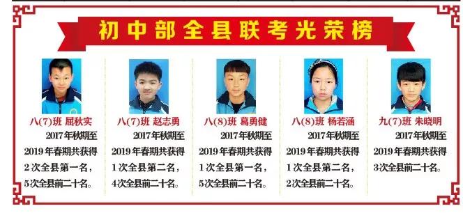 2018年秋期,在全县期中统考中,我校初中部再创新辉煌,6名学生进入全县前10名!23名学生进入全县前100名!有47名学生进入全县200名!屈秋实同学以793.5分的总成绩获得全县第一名。