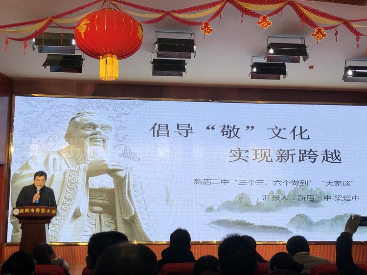 新店二中的梁煜中校长交流的主题是“敬畏之心孕育幸福之花”,他结合新店二中的“敬”文化深刻阐述了常怀敬畏之心的含义。新店二中打造以“敬”为核心的校园文化,从敬人、敬己、敬事、敬物四个方面和一日敬一人、一日敬一己、一日敬一事、一日敬一物四个要求来规范师生行为,从而丰富了师生修养,加强了学校的向心力、凝聚力、创新力和发展力从而实现学校的新跨越。