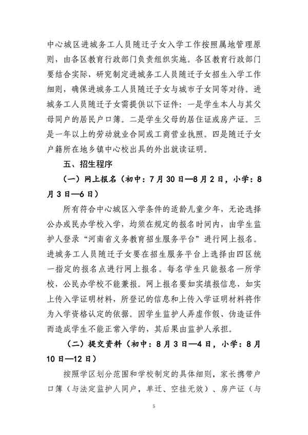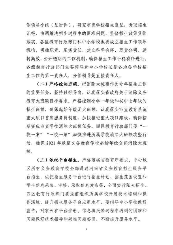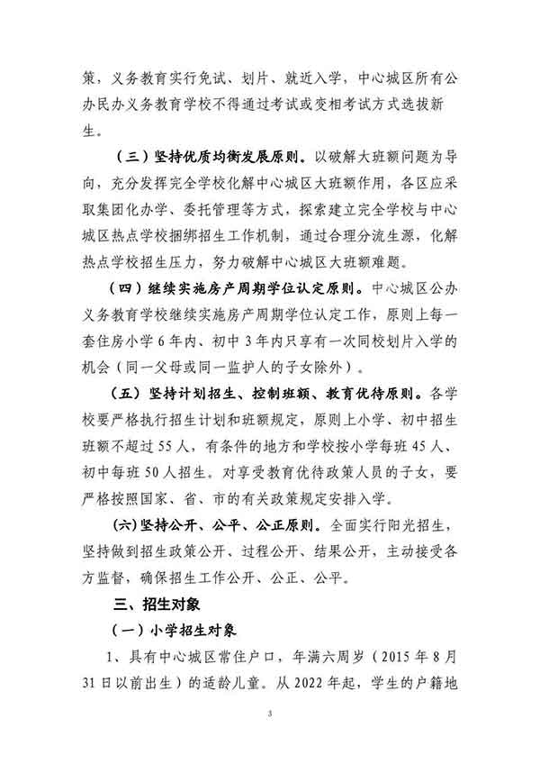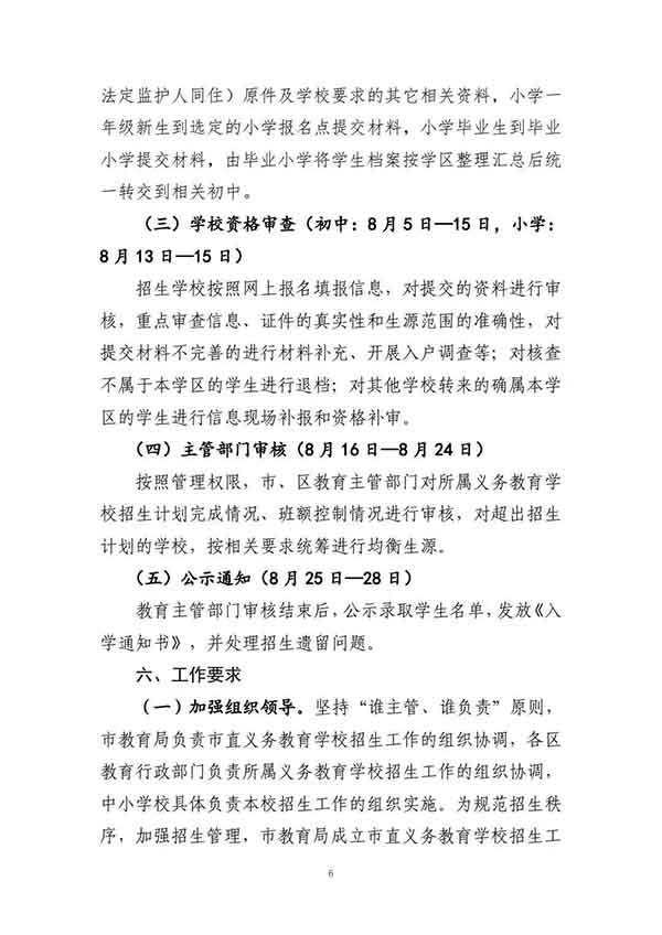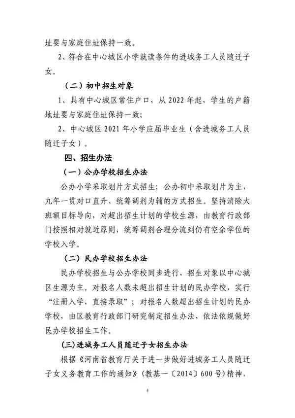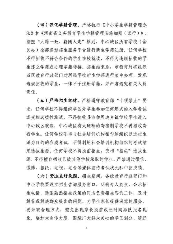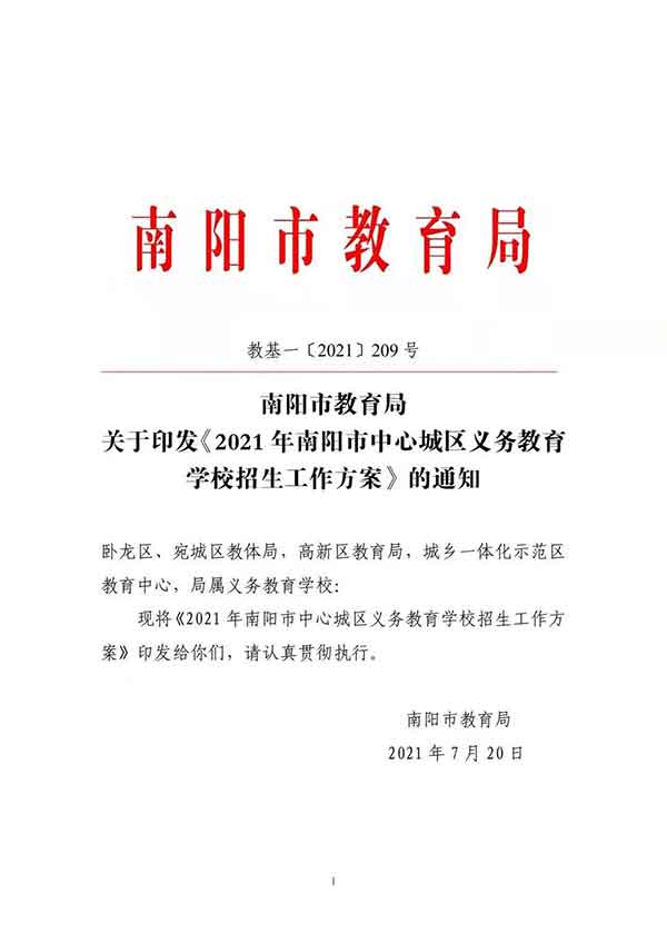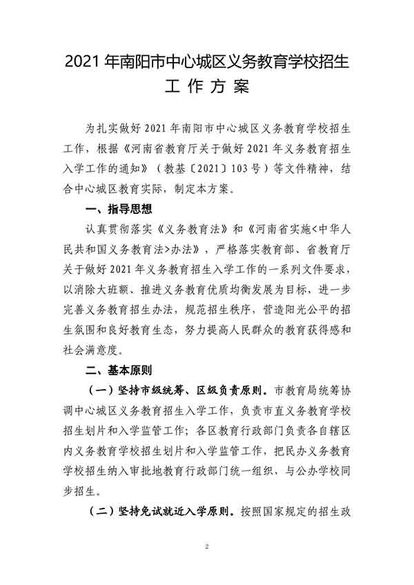 2021年南阳市中心城区义务教育学校招生工作方案 义务教育 入学 未知/阳光 2021-07-29 次浏览 继续实施房产周期学位认定原则,原则上每一套住房小学6年内、初中3年内只享有一次同校划片入学的机会(同一父母或同一监护人的子女除外) 原则上小学、初中招生班额不超过55人 小学招生对象:年满六周岁(2015年8月31日以前出生)的适龄儿童。从2022年起,学生的户籍地址要与家庭住址保持一致 网上报名:初中7月30日-8月2日,小学:8月3日-6日 ..... 南阳家长汇带您提前了解南阳市教育局刚刚发布的《2021 年南阳市中心城区义务教育学校招生工作方案》