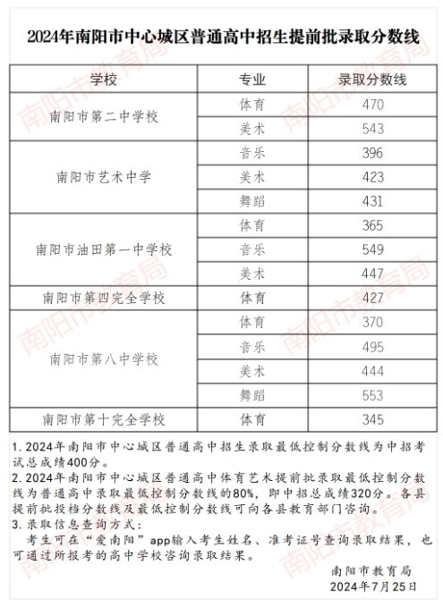2024年南阳市中心城区普通高中招生提前批录取分数线公布